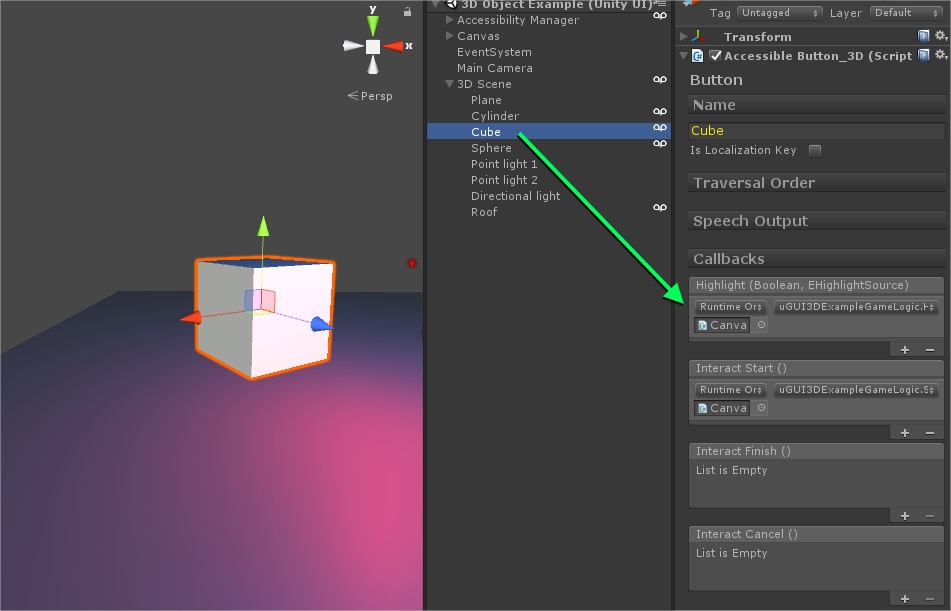 This can be used to make 3D scenes interactive and accessible, for example in point and click adventure games These works largely the same as their UI counterparts, but the setup is slightly different, since the 3D objects are not part of a UI hierarchy.